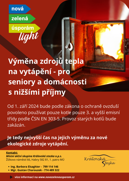 rádi bychom vás informovali, že MAS Královská stezka poskytuje poradenství a pomoc s podáním žádosti o dotaci v programu Nová zelená úsporám Light pro obyvatele území MAS Královská stezka - nově i na výměny starých kotlů a dalších neekologických zdrojů tepla v programu NZÚ Light (pro stejné typy oprávněných žadatelů jako v NZÚ light, tzn. starobní důchodce, osoby pobírající invalidního důchod 3.stupně, případně příspěvek na bydlení či přídavek na dítě).