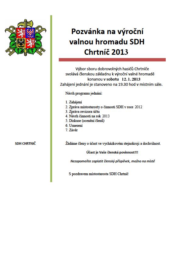 Srdečně Vás zveme na členskou schůzi SDH Chrtníč, která se uskuteční v pátek dne 10.2.2012 v 20.00 hodin v místnosti mysliveckého sdružení (projednání organizace hasičského plesu).
