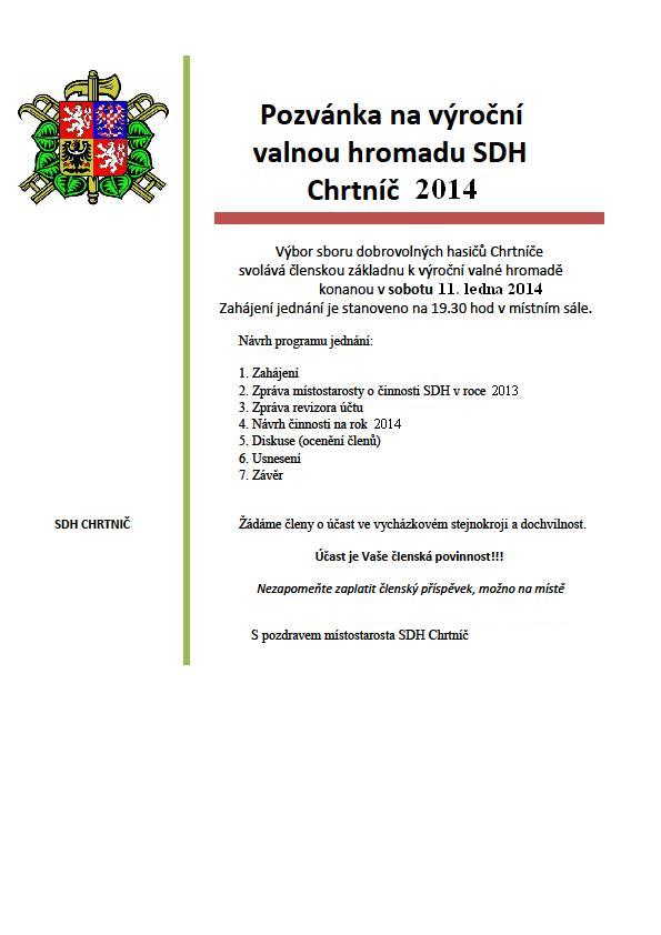 V sobotu 11. 1. 2014 se opět po roce konala Výroční valná hromada sboru dobrovolných hasičů. Akci zahájil starosta sboru pan Milan Poláček přečtením programu a přivítáním hostů i členů našeho sboru. Pozvání přijali starosta obce pan Zdeněk Fanta, místostarosta obce pan Josef Vrána a velitel okrsku pan Jiří Rainiš a pan Mazánek. Jako každoročně se probírala a hodnotila činnost sboru za uplynulý rok, kde se většinou objevila zmínka o kulturních a sportovních akcích, včetně brigád, kterou přečetl Bohumil Doležal. Svoji zprávu přečetl i vedoucí mládeže Zdeněk Fanta ml.a všem představil bohatou a pestrou činnost kolektivu mladých hasičů. Dalším bodem programu bylo odsouhlasení plánu práce na rok 2014 a Josef Vavřička zhodnotil hospodaření sboru a schválení rozpočtu na následující rok.