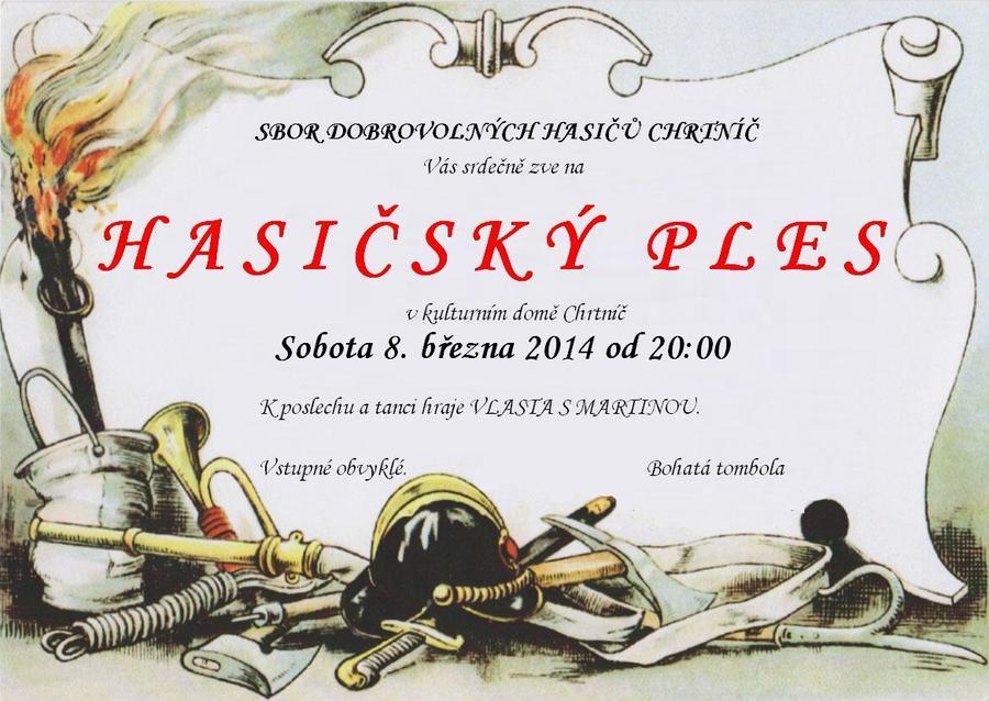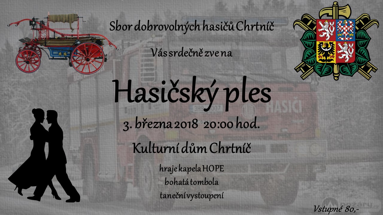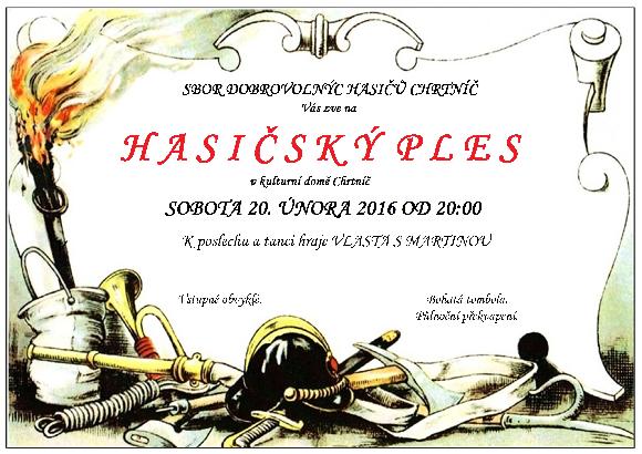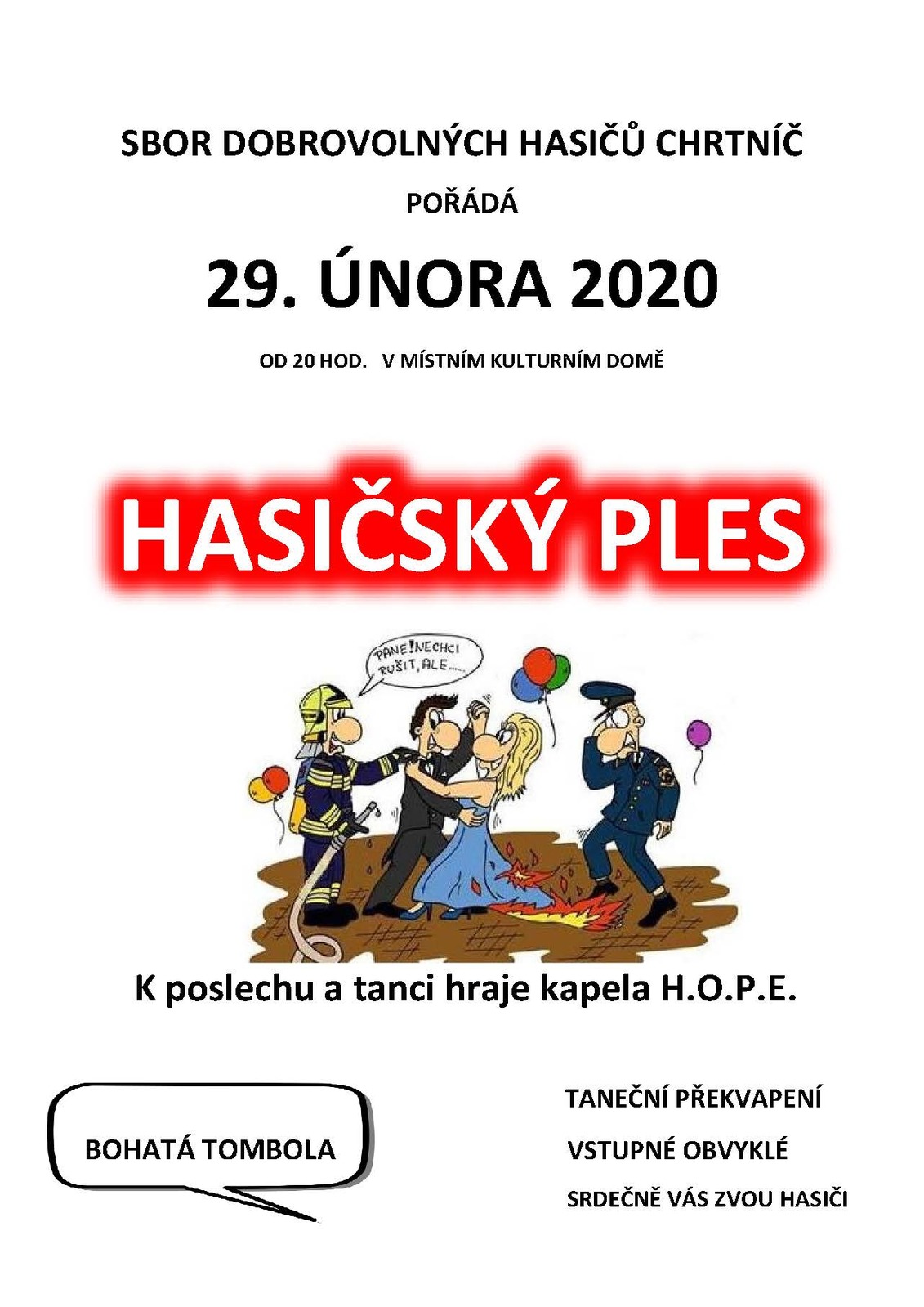 V sobotu 29. 2. od 20:00 hod se opět uskutečnil v Chrtníči Hasičský ples. Tombola rozkradena nebyla, ani nezačalo hořet. Tradiční ples dobrovolných hasičů se obešel bez excesů ze známého Formanova filmu a všichni přítomní se bavili nejen při tanci skupiny H.O.P.E. A hned z kraje večera bylo na parketu plno. Postupně na sále stoupalo napětí. Co letos hasiči nacvičili? Nezklamali – předvedli velmi pěknou choreografii na hit Michaela Jacksona a Gangnam Style.. Bouřlivý potlesk po jejich vystoupení nebral konce. Také byla připravena bohatá tombola, která měla přes 300 cen, za které děkujeme, jak našim členům, tak třicítce sponzorům.