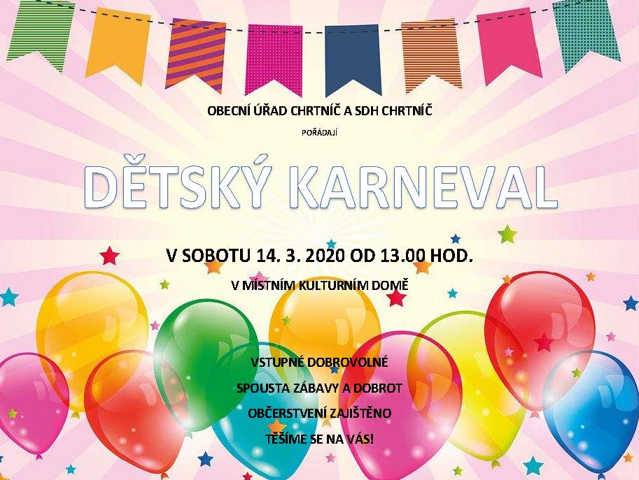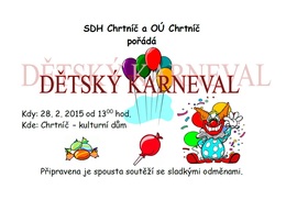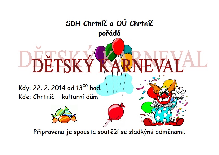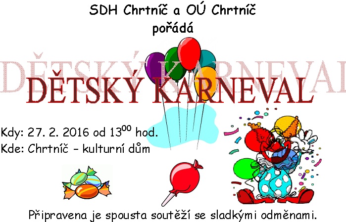 Sbor dobrovolných hasičů v Chrtníči srdečně zve všechny děti, rodiče i ostatní spoluobčany na „Dětský karneval“ který se bude konat dne 25. února 2012 od 13.00 hodin v sále kulturního domu. Můžete se těšit na spoustu soutěží, zábavy, diskotéku, atd. Občerstvení zajištěno.