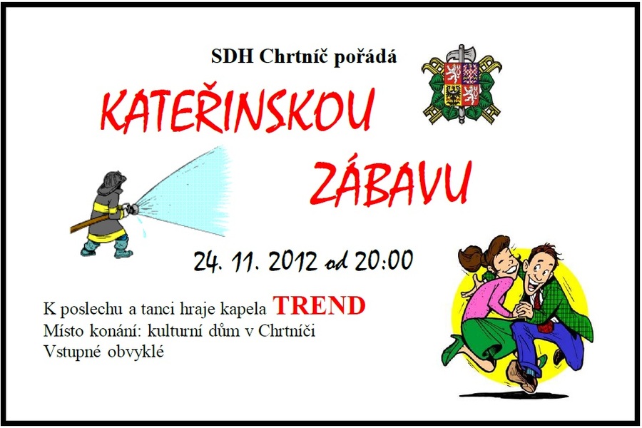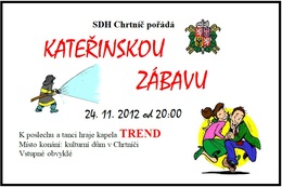 Sbor dobrovolných hasičů zve všechny domácí i přespolní na Kateřinskou zábavu, která se bude konat 24.11. 2012 od 20.00 hod v místním kulturním domě v Chrtníči. K poslechu a tanci bude hrát skupina TREND.