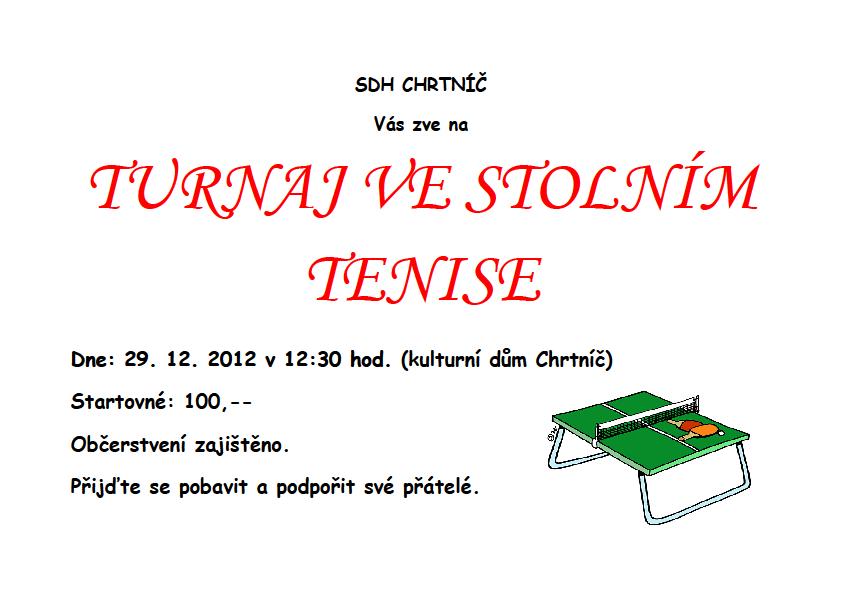 Dne 29.12.2012 od 12:30 hod se konal turnaj ve stolním tenise, který pořádal sbor dobrovolných hasičů. Sportovní akce se zúčastnilo 14 soutěžících. Vítězem turnaje se stal Vébr František, druhé místo obsadil Brada Marek a třetí skončil na stupni vítězů Poláček Milan. Gratulujeme k pěknému umístění. Pořadatelům turnaje děkujeme za vytvoření pěkné atmosféry a sportovního zážitku.