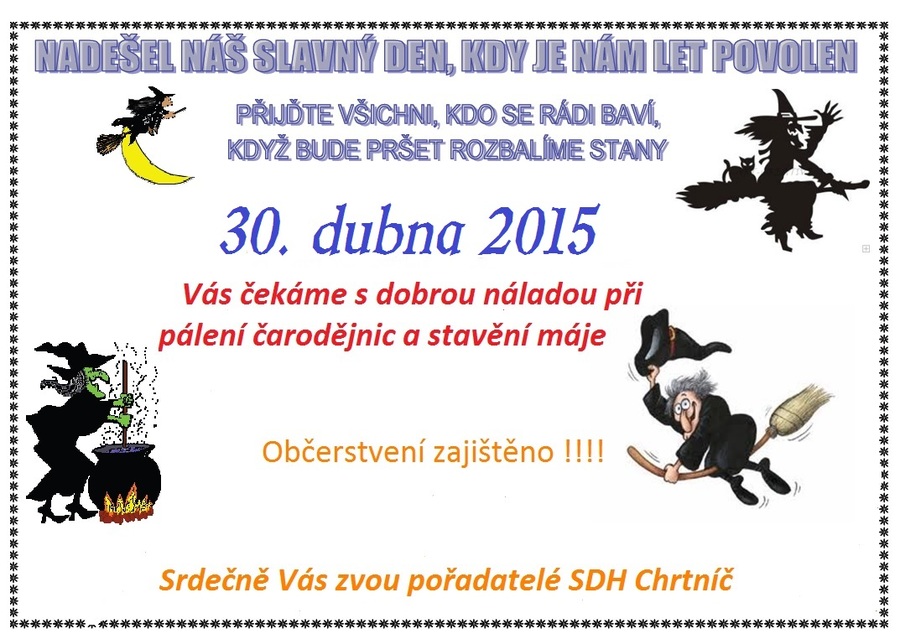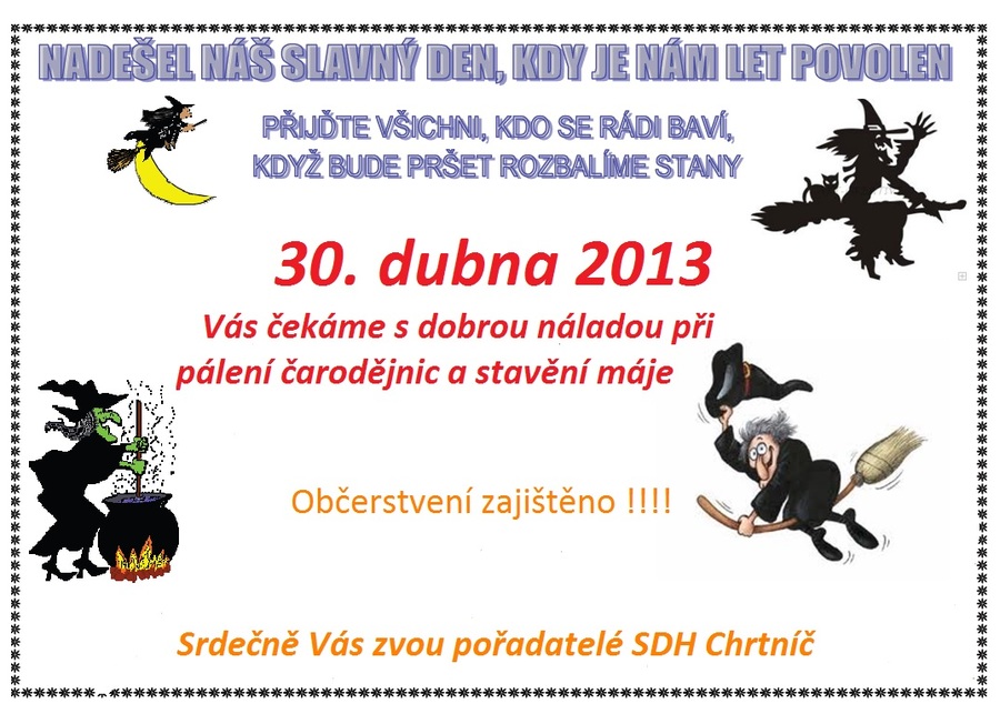 Pozvánka na členskou schuzi dne 20.4.2012 od 20 hod. v místnosti mysliveckého sdružení (projednání organizace stavění máje a pálení čarodějnic)