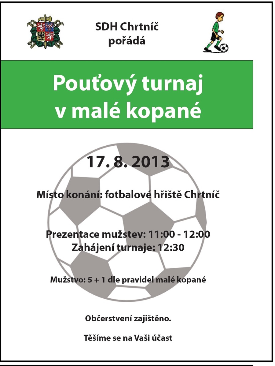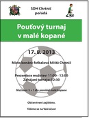 Dne 17. srpna 2013 uspořádal náš sbor dobrovolných hasičů pouťový turnaj v malé kopané. I přes malou účast soutěžních týmů bylo sportovní odpoledne velice plodné. Akci přálo i krásné sluneční počasí. Turnaj byl za potlesku přihlížejících ukončen v 16.30. Od 17 hod. začala taneční zábava pod širým nebem, kde hráli Vlasta s Martinou do pozdních nočních hodin. Tímto děkujeme všem kteří nás přišli podpořit a pobavit se.