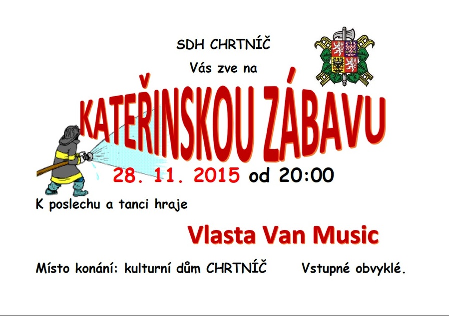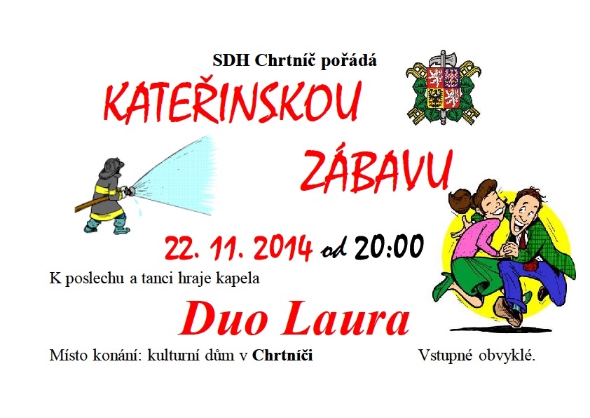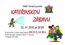 Sbor dobrovolných hasičů zve všechny domácí i přespolní na Kateřinskou zábavu, která se bude konat 23.11. 2013 od 20.00 hod v místním kulturním domě v Chrtníči. K poslechu a tanci bude hrát skupina DUO LAURA.