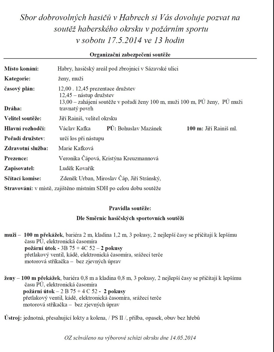 Dne 10. srpna 2013 proběhla již tradiční soutěž o pohár starosty města Habry. Za náš sbor soutěžilo družstvo ve složení: Ostatnický Jaroslav, Vavřička Jakub, Doležal Michael, Brada Marek, Pros Lubomír, Dobrý Pavel, Poláček Milan ml. Naše družstvo se na soutěž velice těšilo a při nácviku měli velice dobré časy. Přesto výsledný čas na soutěži stačil jen na poslední místo. Většina časů byla do 25s což naši nemůžou s naší stříkačkou dokázat.